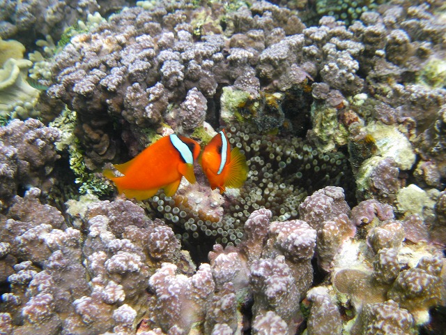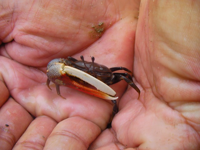 平良港(ひららこう)9時半発の高速先で伊良部島へ渡り、集合場所へ行ってみると、どうやら今日の参加者は僕ら2人だけらしい。 元々8人もいたのに、台風でボードスノーケリングができないと聞いてキャンセルしてしまったとのこと。 なんとしても海に入りたい僕らはビーチスノーケリングでも躊躇いなく参加です。 港でピックアップしてもらい、まずは車で、ビーチ際にある伊島観光サービスさんへ。売店とギアレンタル、シャワー、食堂が併設されている。 気づくと、入り口に、「ヤシガニ飼ってます」の看板。 元々食用として捕らえたものの、客寄せパンダならぬ客寄せヤシガニとして飼育しているそうです。 持ってみるか?と言われ恐る恐るキャッチ。巨大なハサミは人間の指落とすくらい力があるらしい。 マスク、スノーケル、マリンシューズ、フィンを借り、中の島ビーチへ。 結構ダイバー、スノーケリング客が海に入っていました。 45分ほど泳ぎ、その後移動してさらに45分。 浮いてるだけのように見えるけど、結構疲れます。 今回の水中撮影ベストショット スノーケリングのあとは、また伊島観光サービスさんへ戻り、お昼ご飯。 宮古そばをいただきました。 宮古そば しばしの休憩後、午後はカヤックツアーに出発です。 ガイドのケンさんと僕ら2人のプライベートツアーです。(キャンセルが出てある意味ラッキー) 外海は台風15号の影響で危ないので、伊良部島と下地島の間をカヤックで移動します。 橋を3つ超えると、そこにはマングローブの林がありました。 ちょうどこのあたりが、汽水域となっていて、伊良部・下地島でマングローブが育つ唯一のエリアらしい。 マングローブは二酸化炭素の吸収量が他の木に比べて多いので、伊島観光さんもマングローブの植林に協力しているそうです。 僕らも一本ずつ、マングローブを地面に刺して植林し、エコ推進に一役買いました。 マングローブ マングローブ林の近くでガイドのケンさんが捕まえたシオマネキ(もちろんリリースしましたよ。) マングローブ林から帰ったあとは、帰りの高速船の時間まで、伊良部島、下地島観光。 一通り、人気スポットを案内してもらいました。 台風の影響で、前の日夕方までこの日のツアーがあるかもわからない状態でしたが、キャンセルせずに参加して正解だったね! 伊島観光サービス http://www11.plala.or.jp/ijimakan/