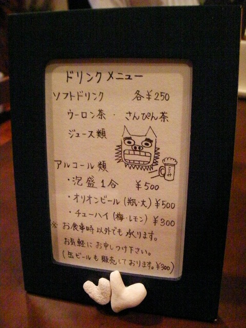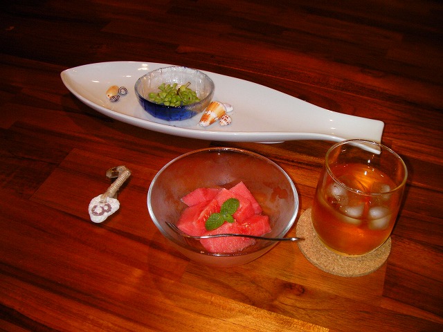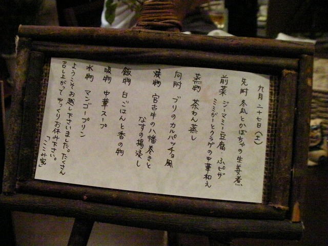 まだ2008年3月にオープンしたばかりのペンションです。 (左)ダイニングの隣にある、畳スペース。ゆったりくつろげます。 (右)ペンション内には観葉植物がたくさん!癒される・・・。 到着すると、スイカと冷たいお茶のおもてなし。 部屋で一息ついて、早速ディナーをいただきました。 ドリンクメニューのフレームには、ハート型のサンゴが2つ寄り添う。(ご夫妻が自分たちで浜で採ってきたんだって。) お話を伺うと、ご主人(とは言っても30代前半。僕ら夫婦と同い年。)は、元プロの料理人。 元々は料理のお店を出したかったそうなのですが、注文を受けてから作るスタイルだと自分の作りたい料理が作れない、とのこだわりから、おいしい料理を出すペンション、というコンセプトにしたようです。 道理でうまいわけだ。量も十分だし、デザートのマンゴープリンもおいしかった! ここみ家さんでの楽しみのもう一つは、貸し切りジャクジー。 ダイニングにおいてある、ジャクジーの予約表です。 そして、22時からはうちの奥様だけ、「天花」さんの出張フェイスエステです。 こ、こわい。。。汗 朝食はこんな感じ。黒糖パンがおいしかった。 はじめは、30代前半でオープン半年、まだなれてないところもあるだろうし、と、あんまり期待はしていなかったのですが、見事に(いい意味で)裏切られました! 部屋、料理、お風呂、サービス、料金、館内の雰囲気、オーナーご夫妻の人柄、どこをとっても、僕的にはほぼ満点。 じゃらんで予約したのですが、帰宅後にアップしたレビューでは全項目、フルマーク5点を付けました。 唯一、難点があるとすれば、ここみ家さんに行き着くまでの案内板等がないので、行き着くのに苦労するかな、ということくらいです。 あんまりお世辞が得意ではない僕たち夫妻も、大絶賛の「ここみ家」さん、絶対おすすめの宿です。 沖縄宮古島に行かれる際は是非!